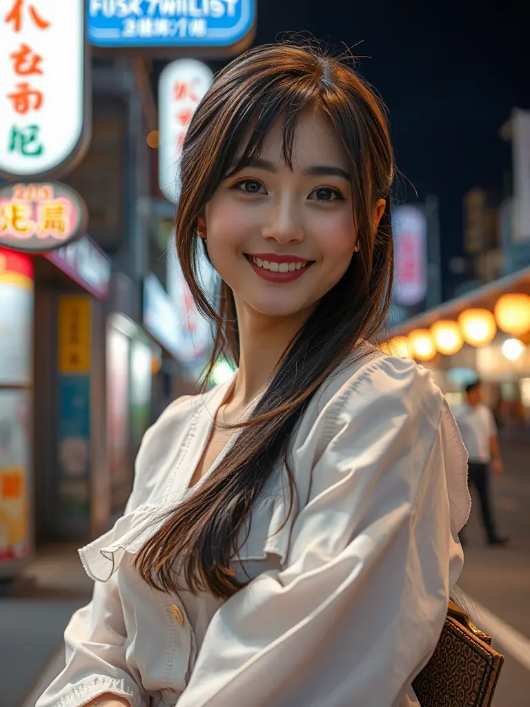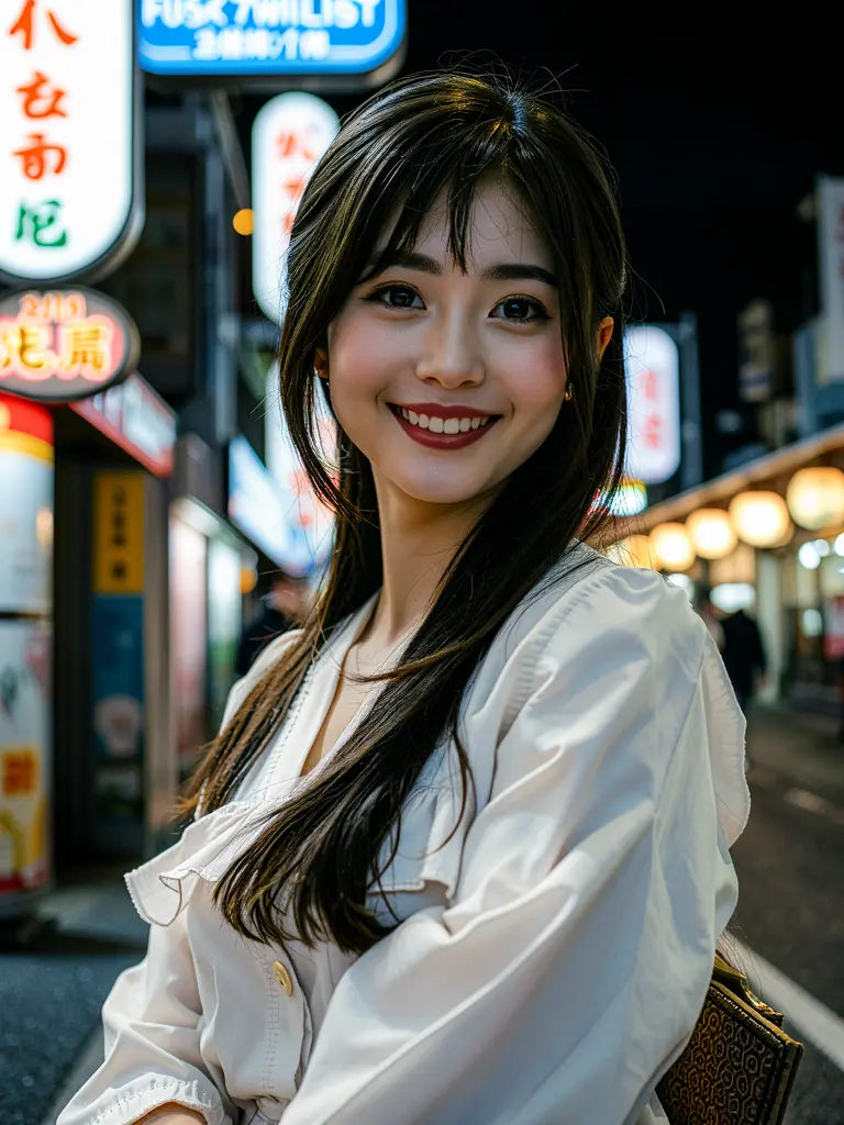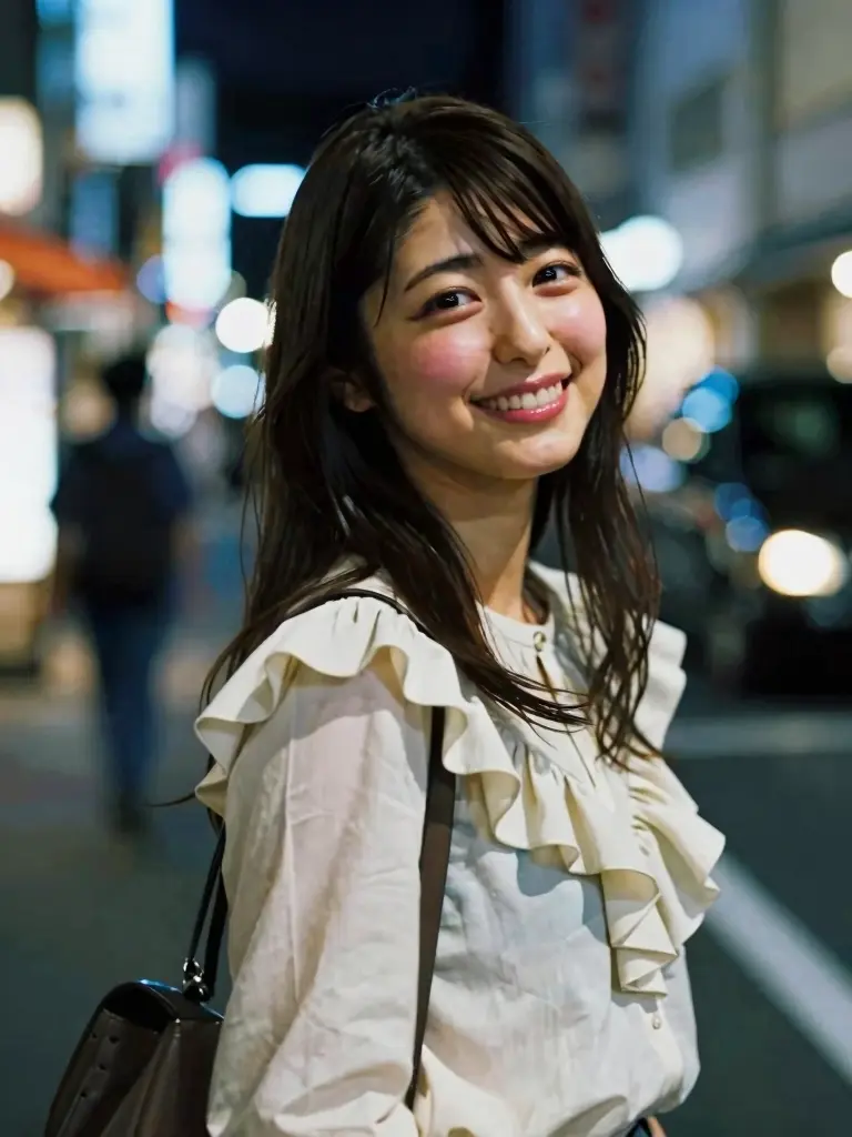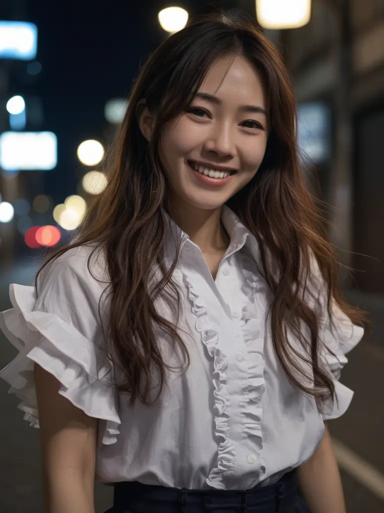 8K、最高品質、傑作、写真のようにリアル、日本女性、ロングヘアー、フリルのシャツ、笑顔、ストリート、夜、映画のようなショット
