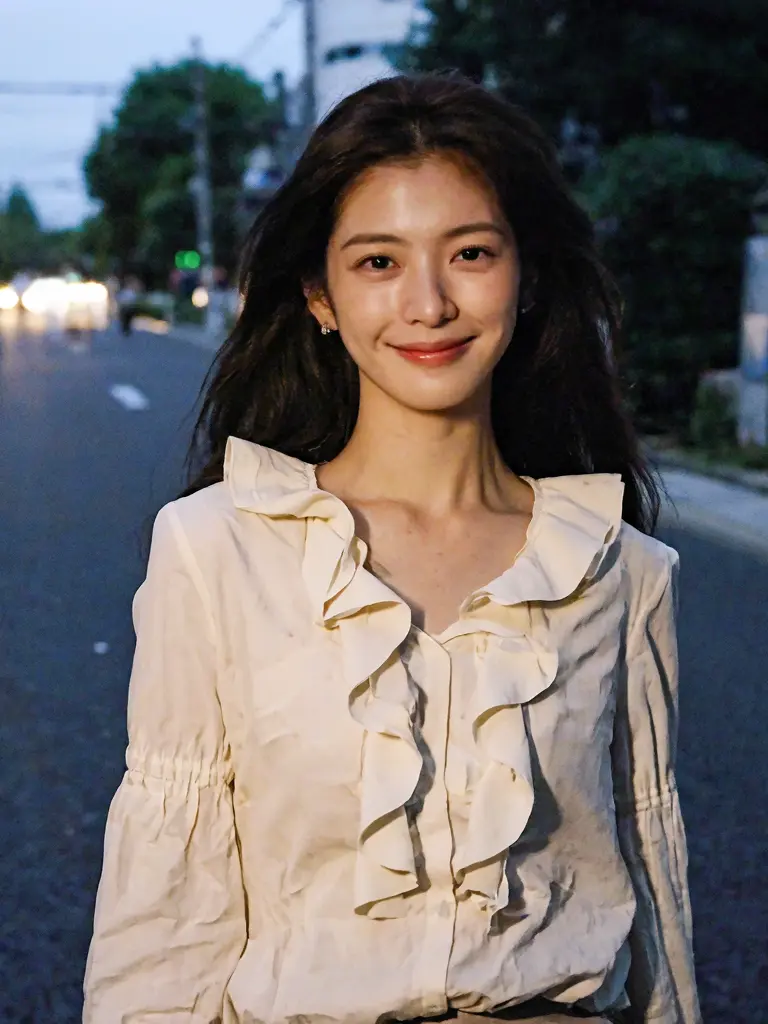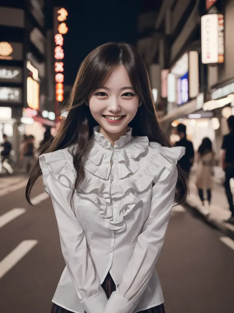 8K,best quality, masterpiece, photo-realistic, japanese woman, long hair, frilled shirt, smiling, street, night, cinematic shot